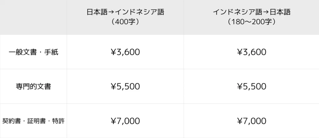 以下に、インドネシア語の翻訳料金を記載いたします。